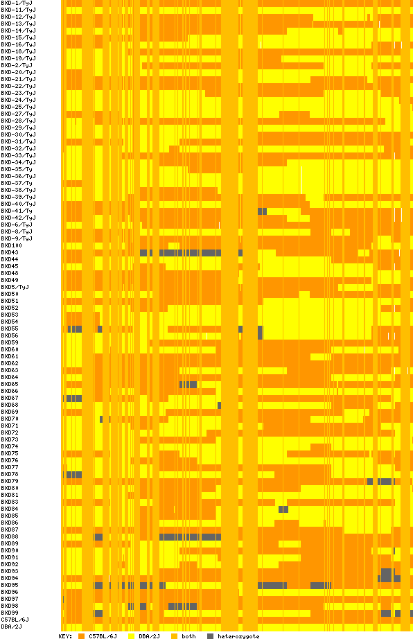 Mouse Recombinant Inbred Line BXD Genotype Data(11th May 2005)This page contains images of the haplotype block structure of the BXD RIL panel. All results are computed relative to Build 33 and Build 34of the mouse genome. In each image, the SNP markers run horizontally and the RI strains vertically. The founders of the panel are at the bottom of the image. Alleles are colour-coded orange (founder A), yellow (founder B). Where the founders do not differ the colour is intermediate. Heterozygote genotypes are black, and missing genoypes white. Thus, in a given RI, haplotype blocks descended from founder A are orange rectangles and haplotype blocks descended from founder B are yellow rectangles. Black rectangles may indicate regions of the genome which have retained heterozygosity despite inbreeding, and white rectangles may represent deletions. BXD haplotype blocks, relative to C57BL/6J and DBA/2J(a) Build34