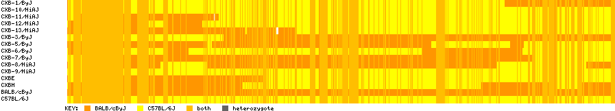 Mouse Recombinant Inbred Line CXB Genotype Data(11th May 2005)This page contains images of the haplotype block structure of the CXB RIL panel. All results are computed relative to Build 33 and Build 34 of the mouse genome. In each image, the SNP markers run horizontally and the RI strains vertically. The founders of the panel are at the bottom of the image. Alleles are colour-coded orange (founder A), yellow (founder B). Where the founders do not differ the colour is intermediate. Heterozygote genotypes are black, and missing genoypes white. Thus, in a given RI, haplotype blocks descended from founder A are orange rectangles and haplotype blocks descended from founder B are yellow rectangles. Black rectangles may indicate regions of the genome which have retained heterozygosity despite inbreeding, and white rectangles may represent deletions. CXB haplotype blocks, relative to C57BL/6J and BALB/cByJ(a) Build 34